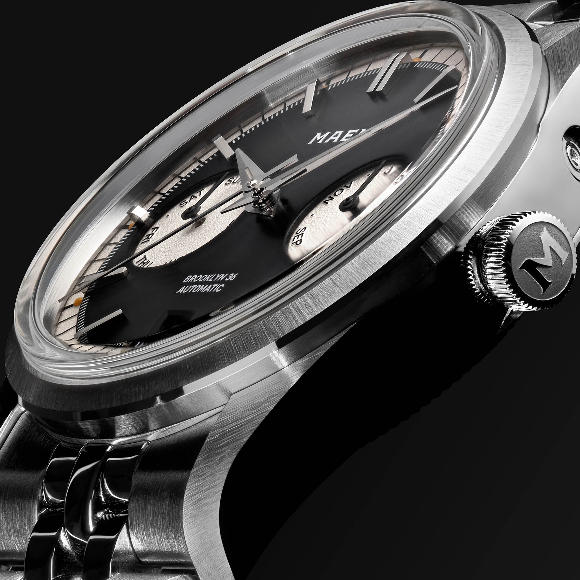 At first glance, the case of the Brooklyn 36 hides the many small details that it houses. Looking closer, you will see the different layers of contrasting finish and their fine transitions. From satin-brushed surfaces on the top of the bezel, lugs, and case sides to the highly polished chamfers on the case and bezel.