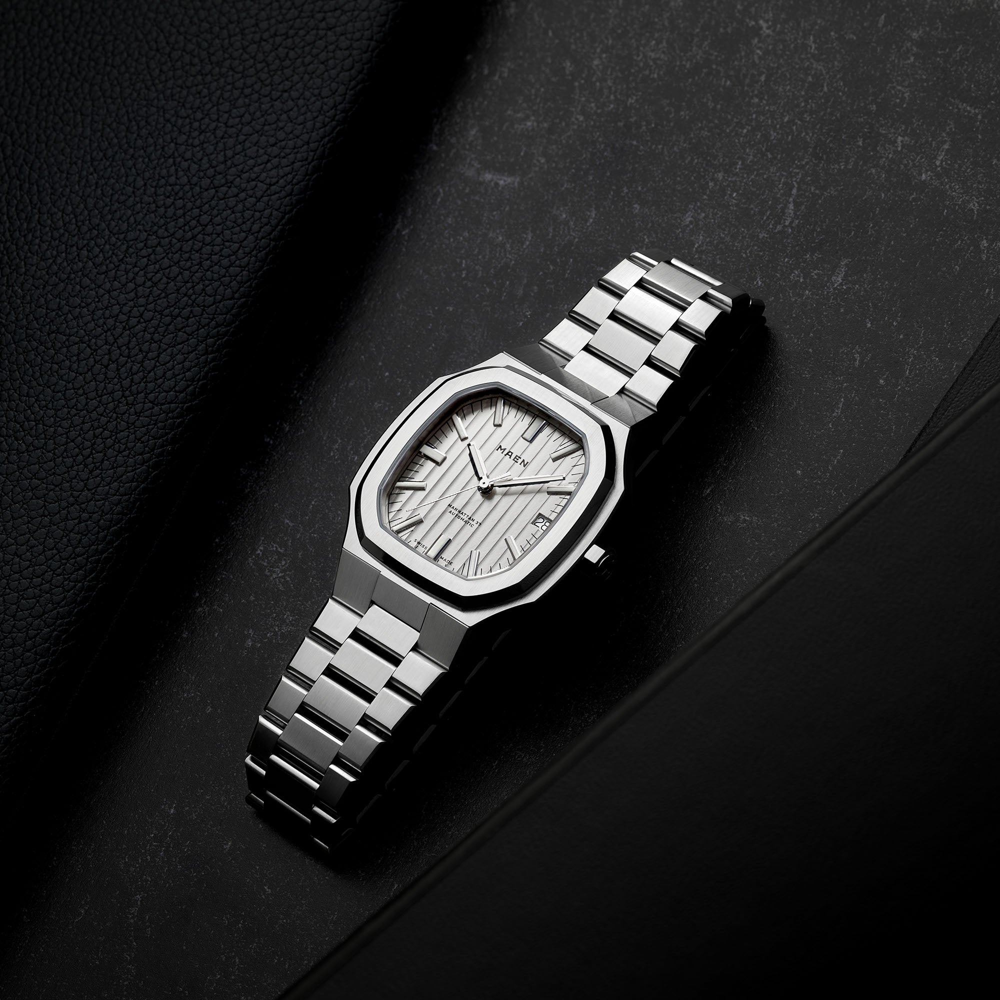 The Manhattan 37 has an unique vertically elongated Côtes de Genève dial that creates a spectrum of beautiful shimmers depending on the lighting.